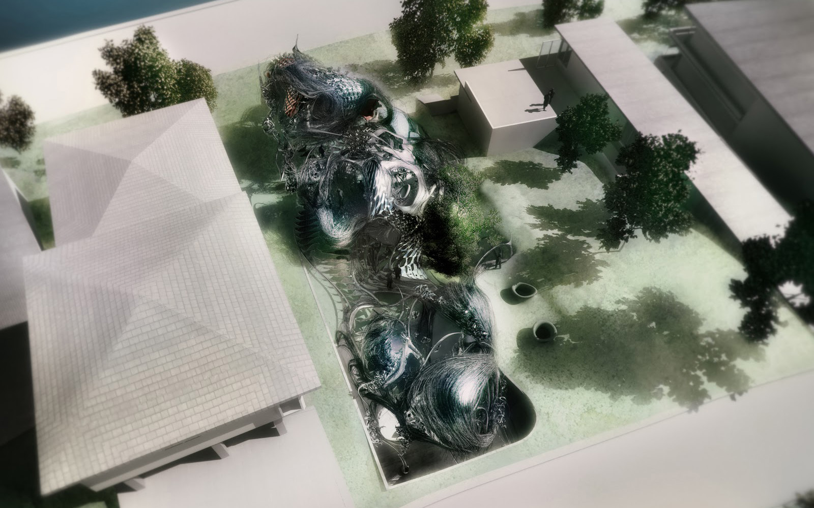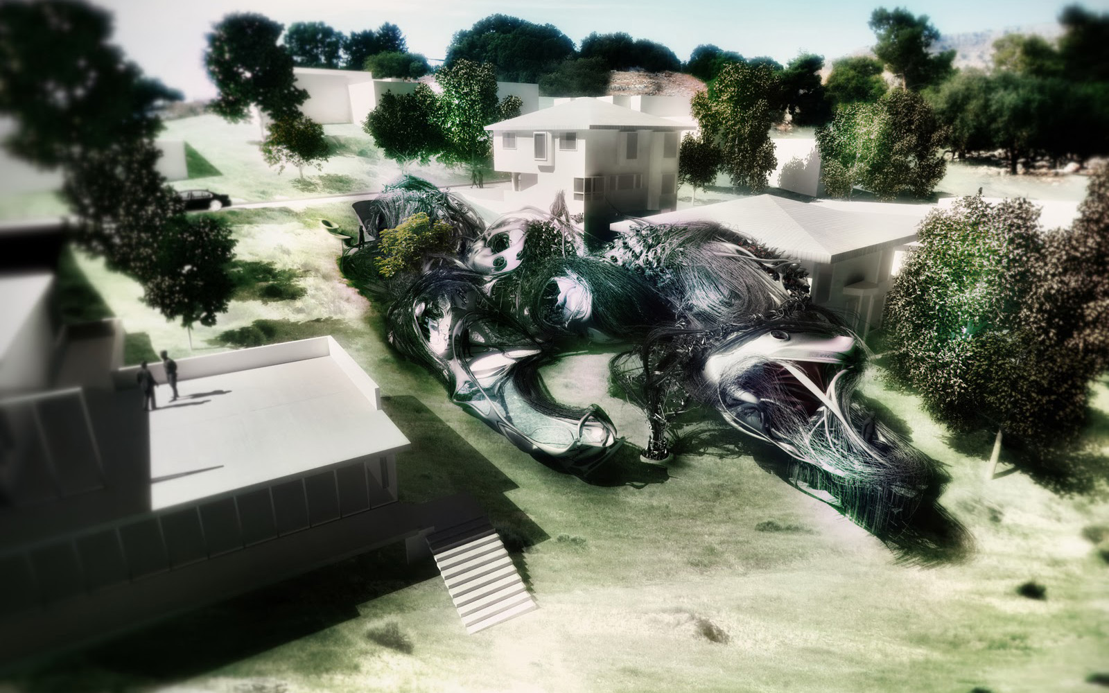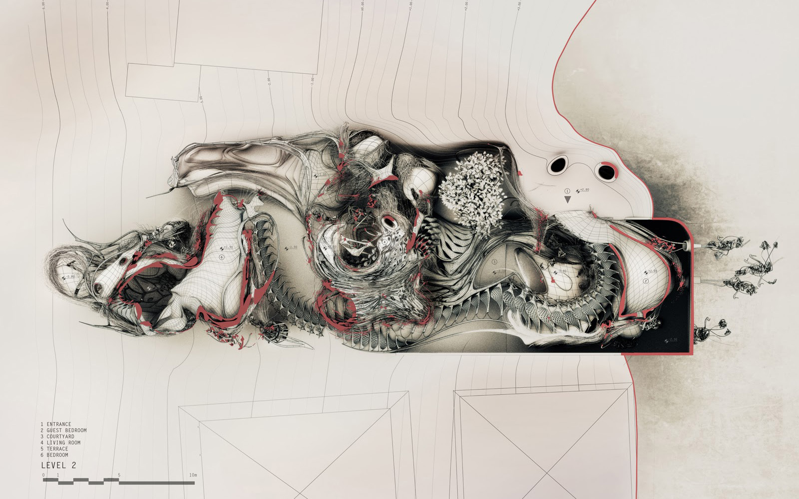 Situated on the outskirts of Los Angeles, the design commences with the standards of a typical single-family house. The boldness of the form becomes a tool to craft an aesthetic capable of challenging original principles and engaging in a dialogue with contemporary lifestyles. The project unfolds as a seamless blend of traditional elements, fostering emotional connections through shared social memories, while introducing external influences that bring forth new behaviors and perceptions of space. The house is organized into three units. The first, a semi-subterranean structure, houses the main entrance and service areas. Public spaces occupy the ground-level second unit, while the third unit accommodates private rooms, detached from the ground. All three units are aligned at the same height, with the sloped topography defining the morphological and structural characteristics of each piece. Externally, the assertive design features a combination of wire linework, movable facade panels, and metallic surfaces, establishing a striking contrast with the soft and uninterrupted interiors.